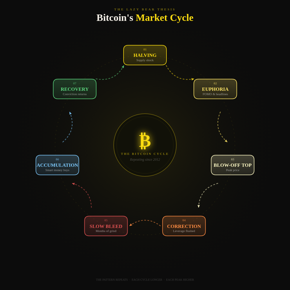 Following the slow bleed, a prolonged base forms likely within a well-defined price zone, building the foundation for the next halving cycle anticipated in 2028.