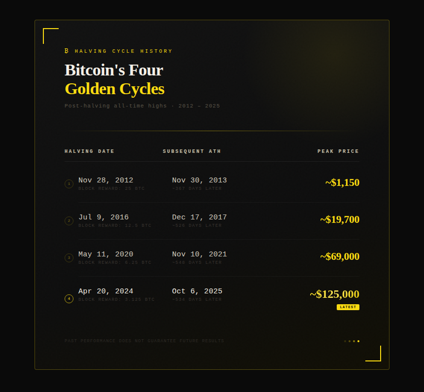 Historically, each halving has preceded a major bull run and a new all-time high within roughly 12–18 months as seen in the image below. Past performance does not guarantee future results. But the structural rhythm has proven remarkably consistent across four consecutive cycles.