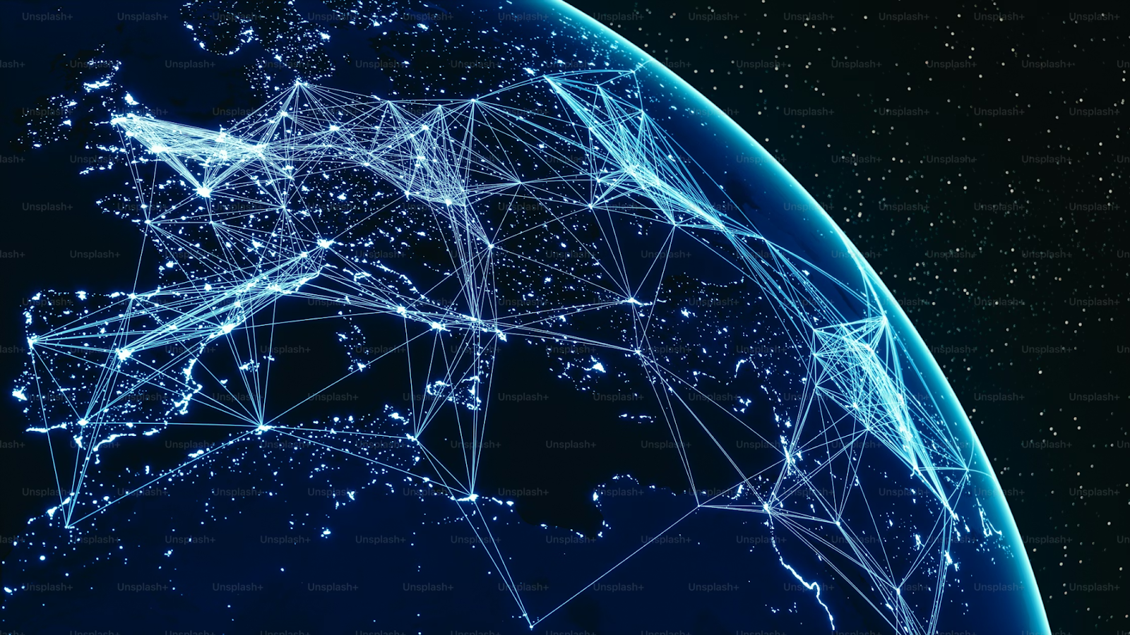 Alt text: Satellite-style view of Earth with illuminated connection lines between major cities, illustrating global digital networks (link)
